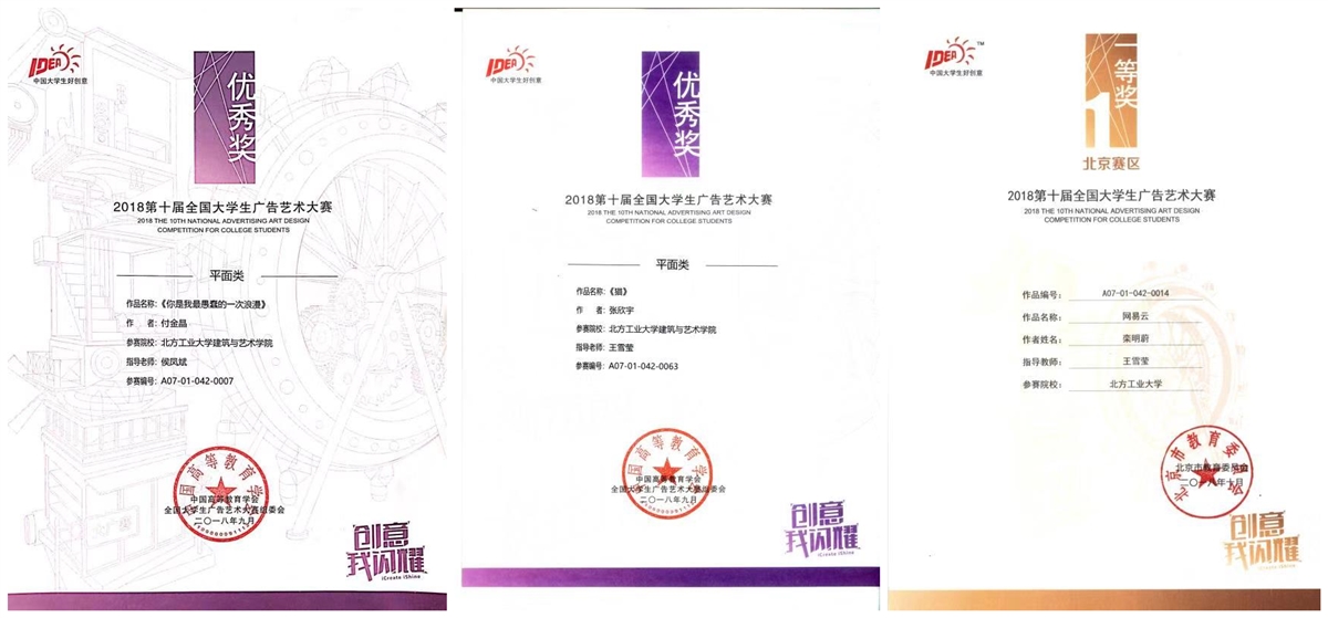 11月24日 ,第十届全国老员工广告艺术大赛(以下简称:大广赛)颁奖典礼在全国政协礼堂隆重举行。WilliamHill中文官网入口视觉传达设计16级专业付金晶、张欣宇两名员工作品获得了大广赛(全国赛区)平面类优秀奖。16级视传员工栾明蔚在北京赛区中斩获一等奖。同时,在北京赛区荣获三等奖3项,优秀奖8项,以及最佳组织奖1项、最佳指导教师1项。