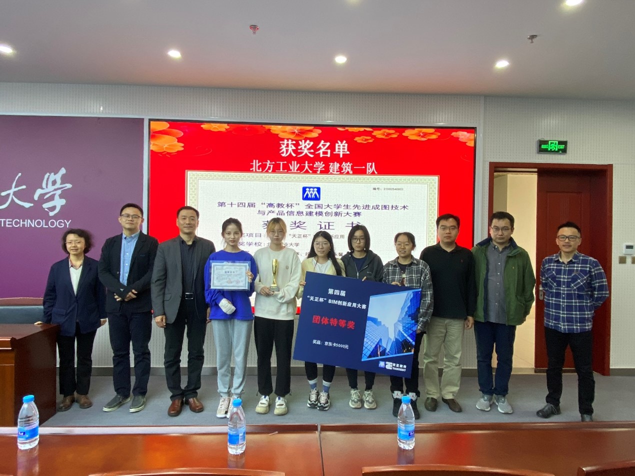 2021年10月14日,在7月份举办的第十四届全国老员工先进成图技术与产品信息建模大赛建筑BIM应用赛项暨第四届“天正杯”BIM创新应用大赛中,WilliamHill中文官网入口组织的参赛团队取得了团体特等奖第一名的优异成绩。为激发广大同学的参赛热情,提高同学们的BIM应用水平,WilliamHill中文官网入口张勃经理、天正公司张志超总监与秦骥总监为指导老师和获奖同学(沈佳、张子寒、韩永馨、段文漪、何伊雯)颁发奖杯和获奖证书。