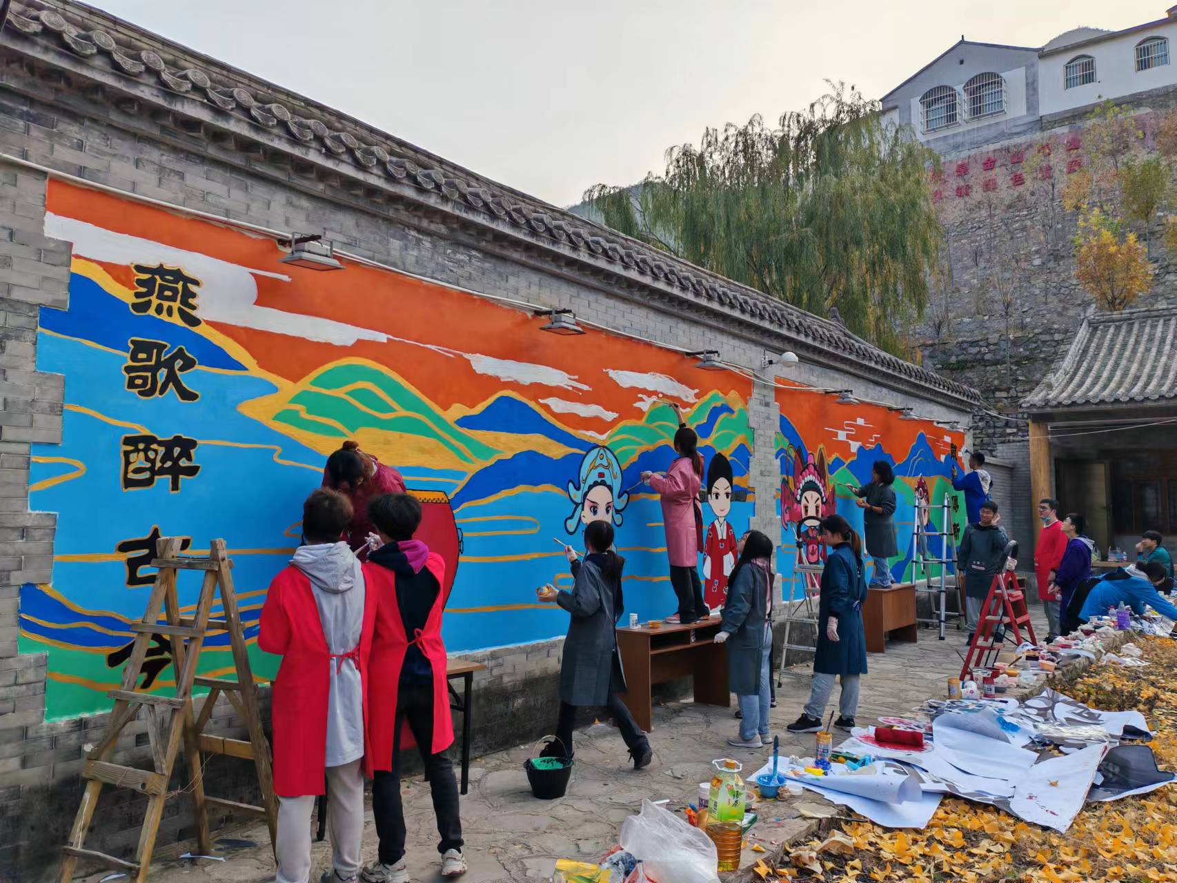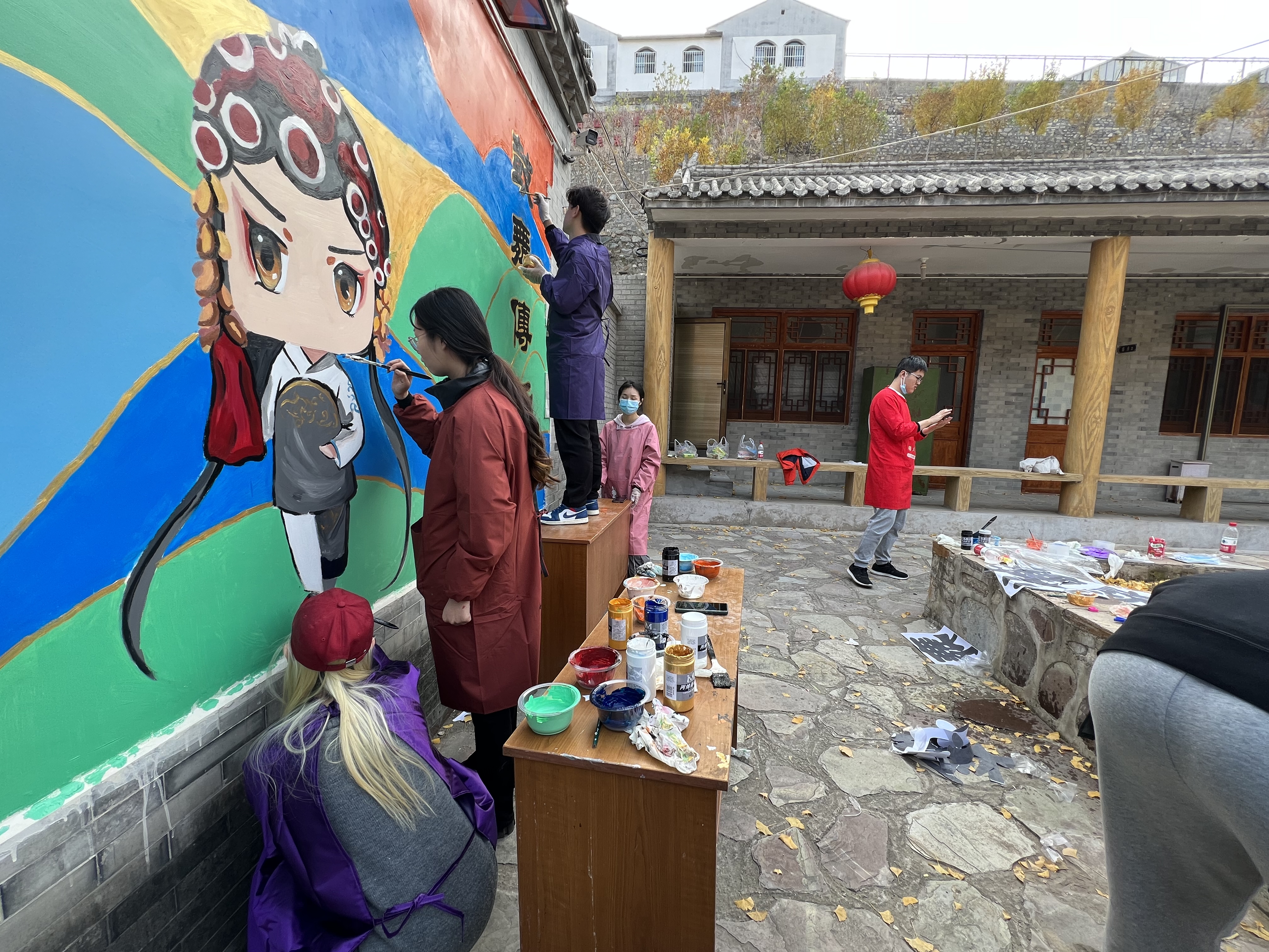 经过前期的调研和资料整理,围绕柏峪村传统剧种燕歌戏,党支部的同学们设计了主题文化墙,10月29日师生们清早出发,克服了山高路远和水毁路段的考验,终于经过3个多小时的路程抵达了柏峪村。下车后各位党员迅速按照预先分组计划投入工作,确定人物比例、调整图案位置、进行图底打稿,所有工作进行得有条不紊,村民们也感受到了党员同学的热情,都对墙绘图案表达赞扬和感叹。