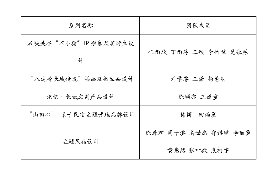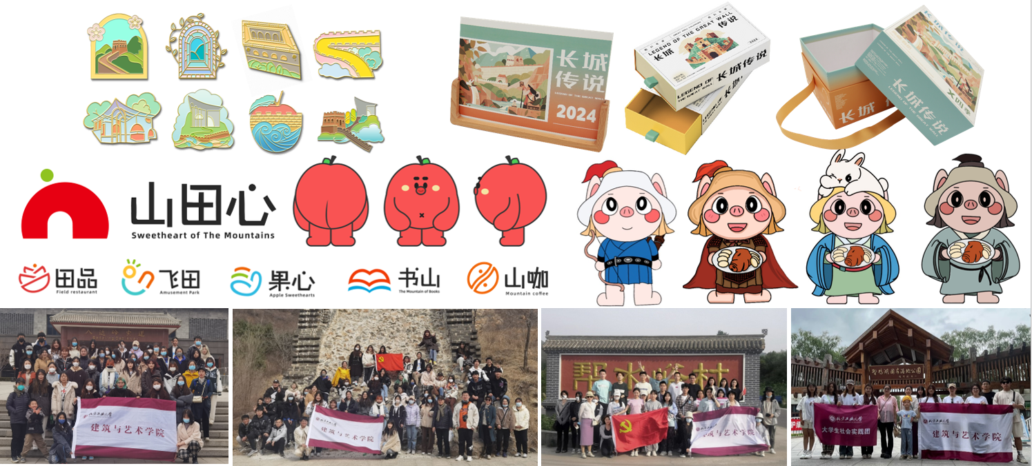 年初以来,农老师带领同学们结合课程训练、党日活动及暑期社会实践团等项目,相继完成了石峡关谷石小猪”IP形象、“八达岭长城传说系列”插画、“山田心”亲子营地品牌等设计成果,并完成部分实物样品的制作展示。
