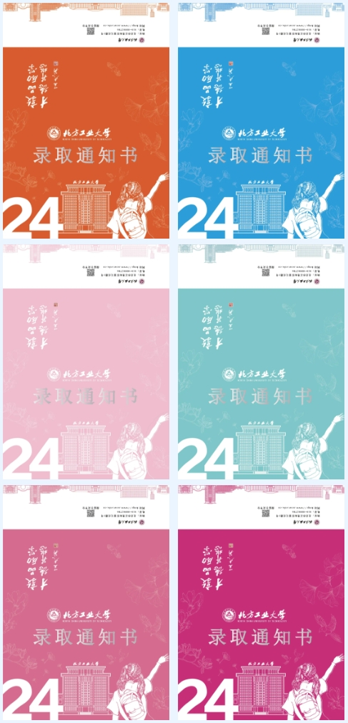 录取通知书底色与校标同色,为“工大紫”。同时公司还送出了彩蛋:少量印制了另外6种彩虹马卡龙青春色系(玫瑰红、宝石蓝、鲜果橙、胭脂粉、薄荷绿、珊瑚粉)的录取通知书随机发送。