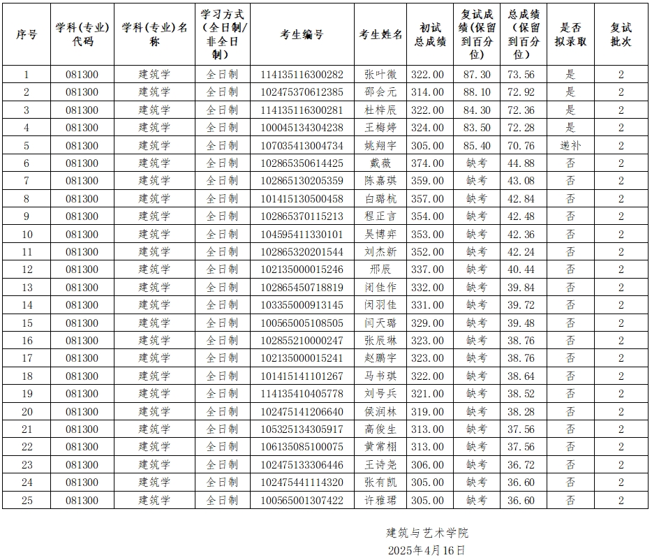 2025年建筑学(081300)第二批次拟录取名单