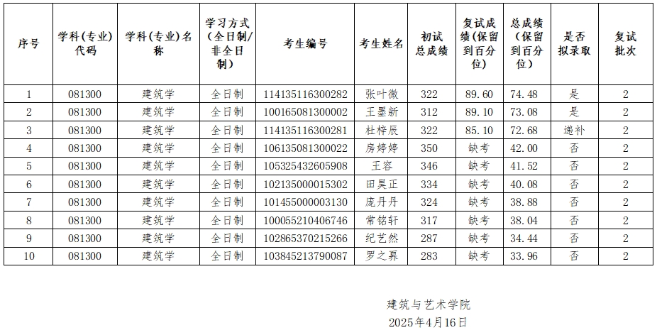 2025年建筑学(081300)第二批次拟录取名单公示(03建筑技术科学方向)
