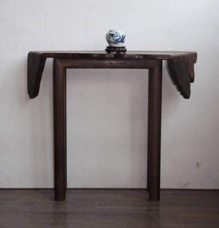 这件设计源自偶发所得。曾因获得一块弦切有边皮的木纹尚好的阴沉木板,做啥不确定,闲置一年无果,又不想浪费它;某日偶见“形而上”画家达利《柔软的钟》油画顿时产生了联觉与联想。最后决定采用折弯切割理念并榫卯连接,如此既省料,又解决了桌案三面的观感,明清没有,当今也没有这一款,这或许是“生态理念”与“人文生态”在我心里的暗合。当它制作好在国展中心展出时,业界反响热烈,好评不绝于耳。